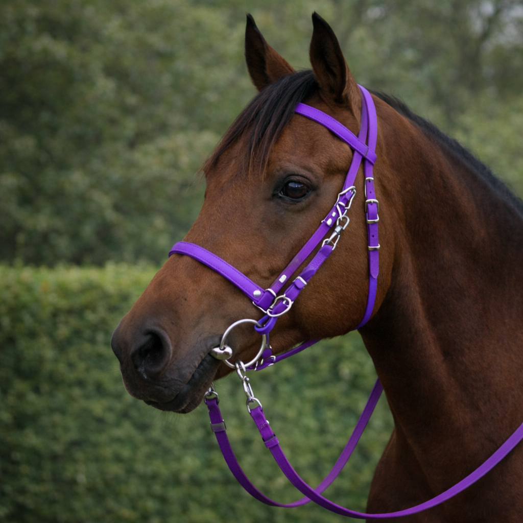 Featuring an integrated halter, this bridle makes handling and riding easier, whether you’re hacking out, schooling, endurance riding, or spending long hours in the saddle. Crafted from premium Biothane, it does not absorb sweat, moisture, or dirt, making it exceptionally easy to care for.